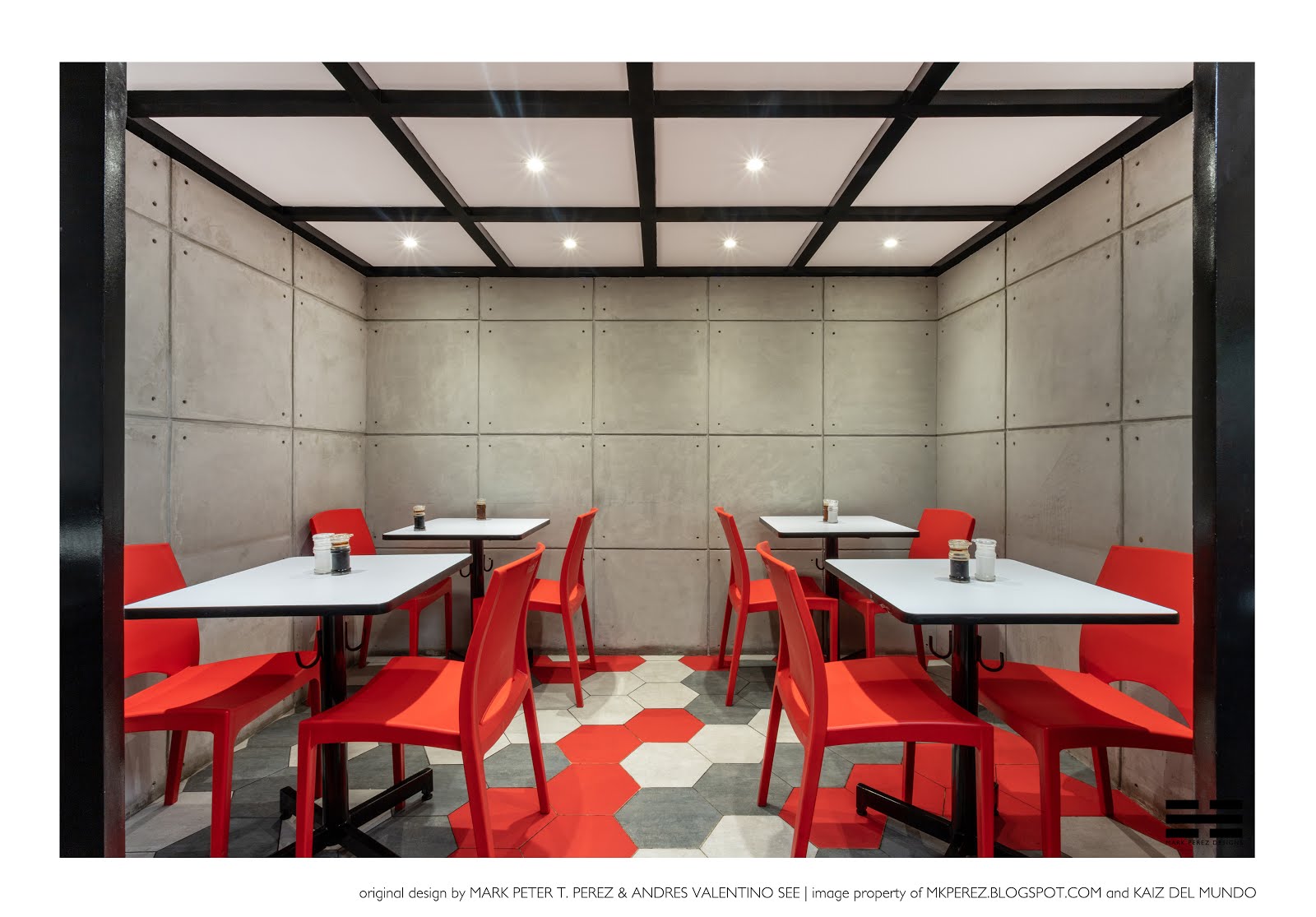 Increased seating capacity was also needed, so a portion of the kitchen was removed to make way for more patrons. Situated at the far-end corner of the restaurant, diners can enjoy a bit more privacy with Chinese style dividers against an Ando-inspired cement wall- finish backdrop. Making use of the existing wooden tiles, but wanting to add a modern twist, a mix of red and gray hexagon tiles were installed in the new dining area. These touches of geometry and color on the floor blend well with the rest of the interiors, dictating further how old and new merges together . Modern plastic chairs in red are partnered with rustic wood benches; while traditional-looking gray brick tiles contrast with white square tiles.